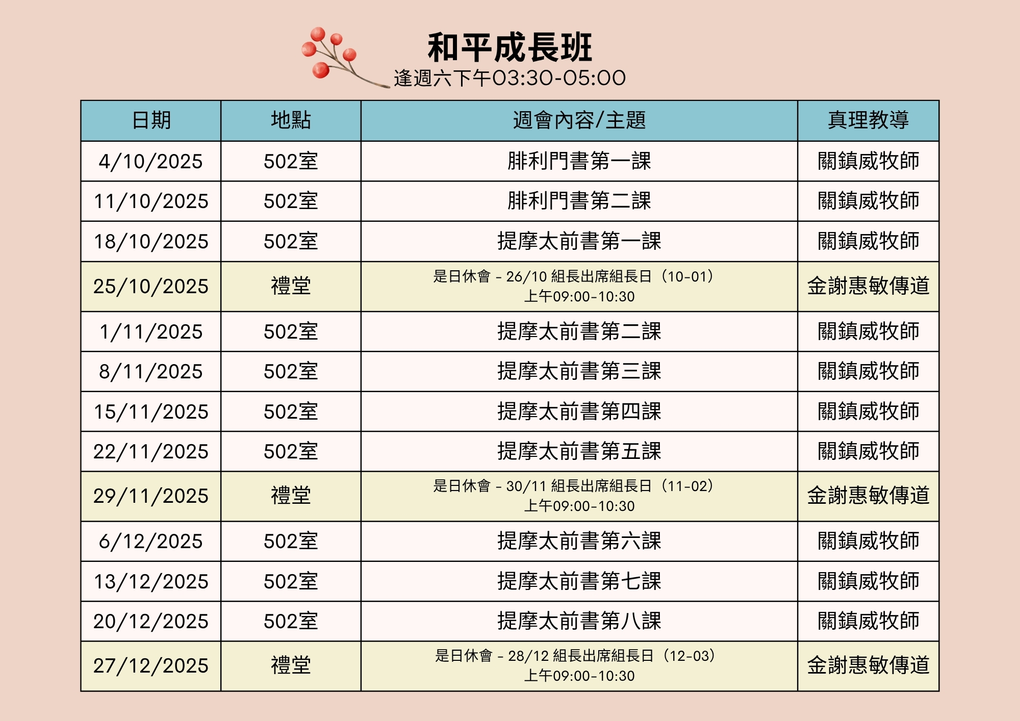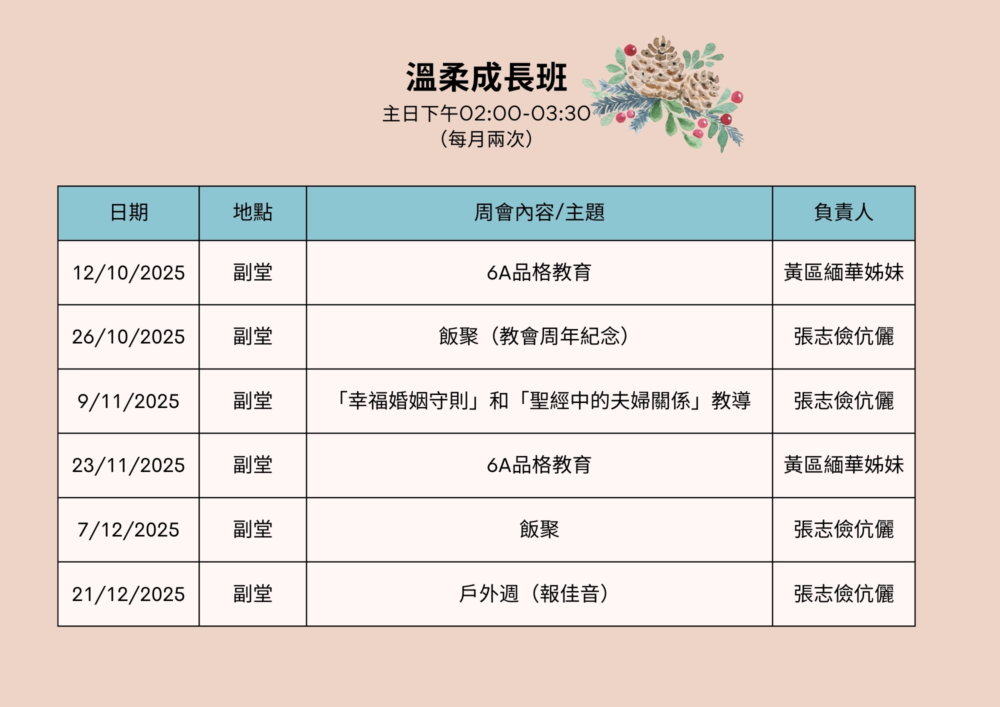 成人部 教會活動 成長班2025年10-12月課程 愛浸人:一敬拜。一事奉。一成長班 成長班目標:聖經教導、團契相交、事奉裝備、傳揚福音 仁愛成長班 時間:周日 9:00-10:30am 查經式周會,適合喜愛查經分享模式。 喜樂成長班 時間:周日 9:30-10:30am 導師式教導,適合新受浸者及幼稚園家長參與。 和平成長班 時間:周六3:30-5:00pm 查經式周會,適合喜愛查經分享模式。 溫柔成長班 時間:隔周日 2:00-3:30pm 與資深會友分享子女管教心得,適合幼稚園及小學家長參與。 如有查詢,請與教牧團隊聯絡。